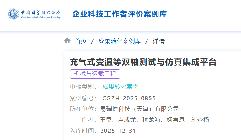 近日,易瑞博科技(E-rubber)一项关于“充气式变温等双轴测试与仿真集成平台”的技术实践案例,经过评审,入选了中国科协企业创新服务中心建设的“企业科技工作者评价案例库”。